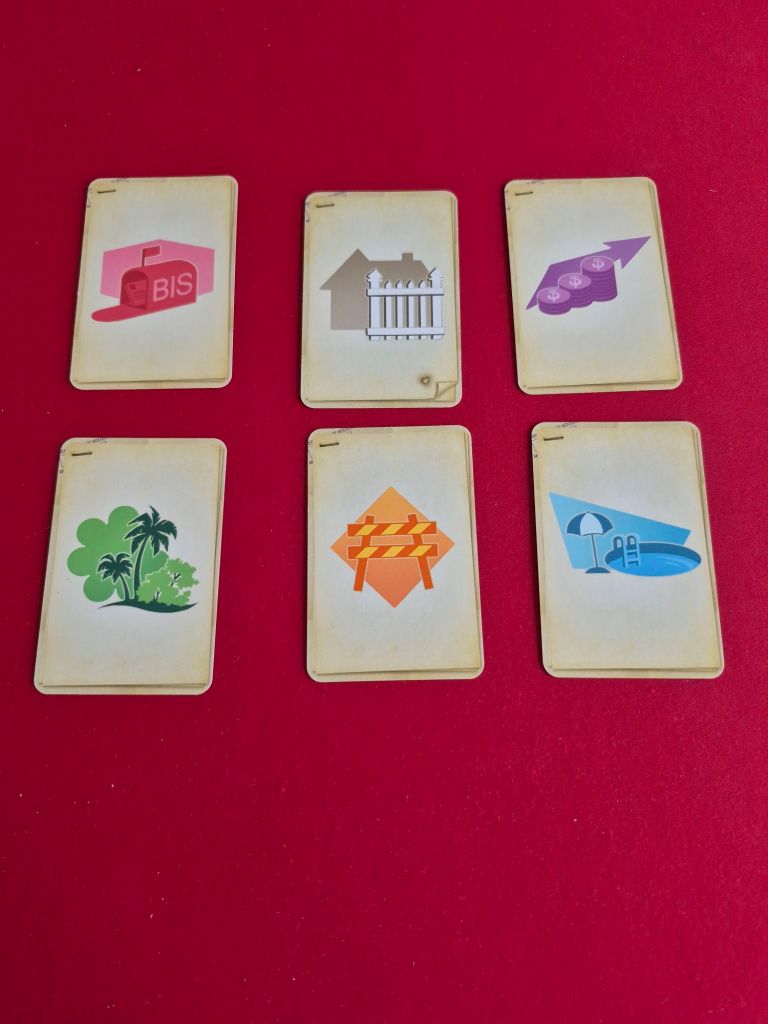 On your sheet of paper there is a picture of a neighborhood and a pointcounting system on the lower side. There are three rows of houses on your paper. The upper row has 10 houses, mid row 11 houses and the bottom row has 12 houses. Every turn you flip three cards and chose what house to use.